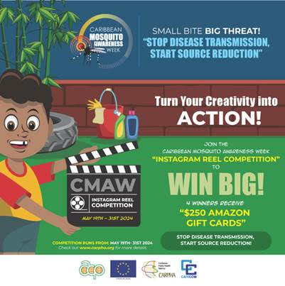 La presentación se aceptará a partir del lunes 19 de mayo de 2024 y habrá cuatro ganadores de la tarjeta de regalo de Amazon valorada en USD$250. Visite la página web del Concurso de carretes de Instagram de CMAW para conocer las pautas y reglas: https://caribbeanmosquitoweek.carpha.org/Instagram-Reel-Competition