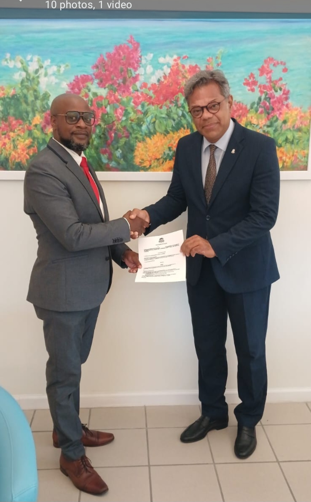 FOTO: Khalil Revan, candidato número 4 de Demoratic Party (DP), presenta el proyecto de reglamento al Primer Ministro Luc Mercelina.