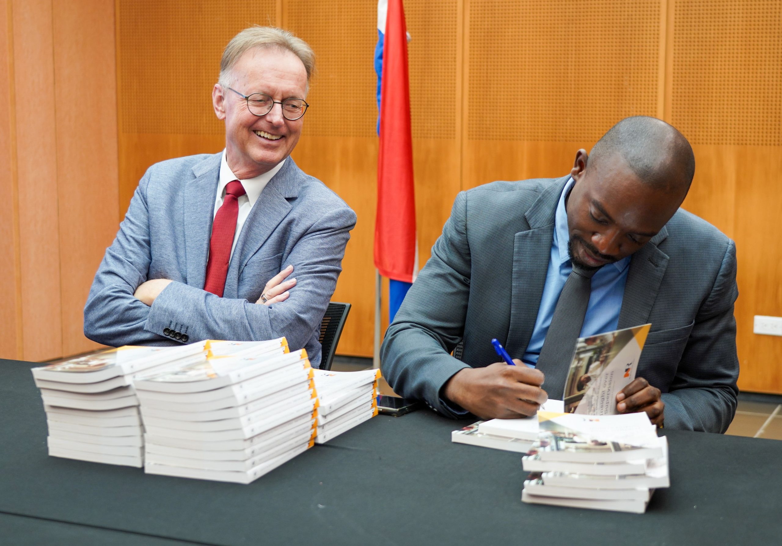 El libro fue firmado por el Ministro de Finanzas, Ardwell Irion, y el Profesor dr. Frank Kunneman, editor del libro. Los asistentes tuvieron una breve interacción con el Ministro y el Profesor Kunneman durante la cual cada uno compartió su motivación para postularse al Programa de Jóvenes Profesionales en Prácticas en Gobierno Corporativo.