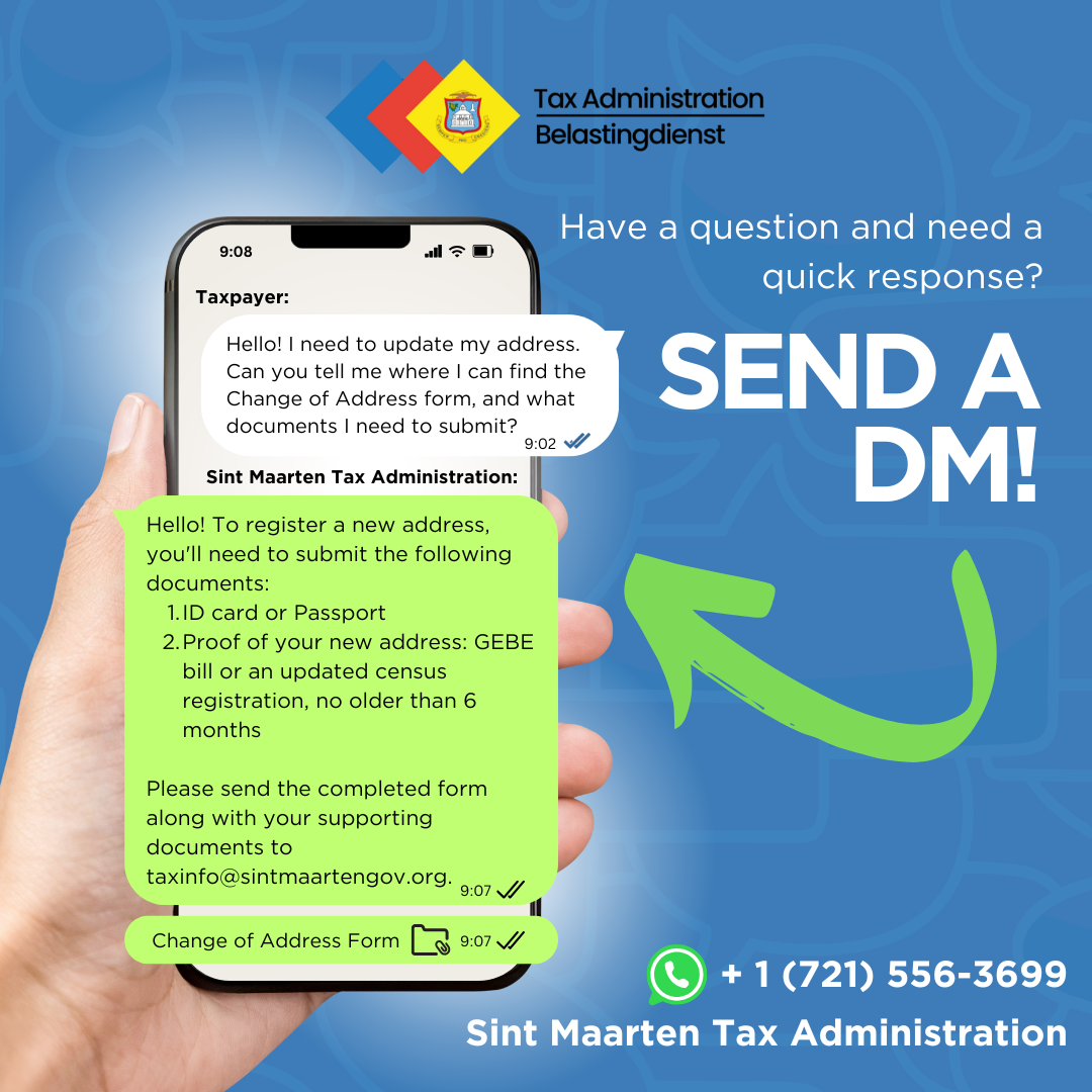 Philipsburg, St. Maarten – La Administración Tributaria se complace en anunciar el lanzamiento de su nuevo servicio de WhatsApp, diseñado para mejorar la comunicación y ofrecer a los contribuyentes una forma más rápida y cómoda de contactar con el Departamento de Hacienda.
