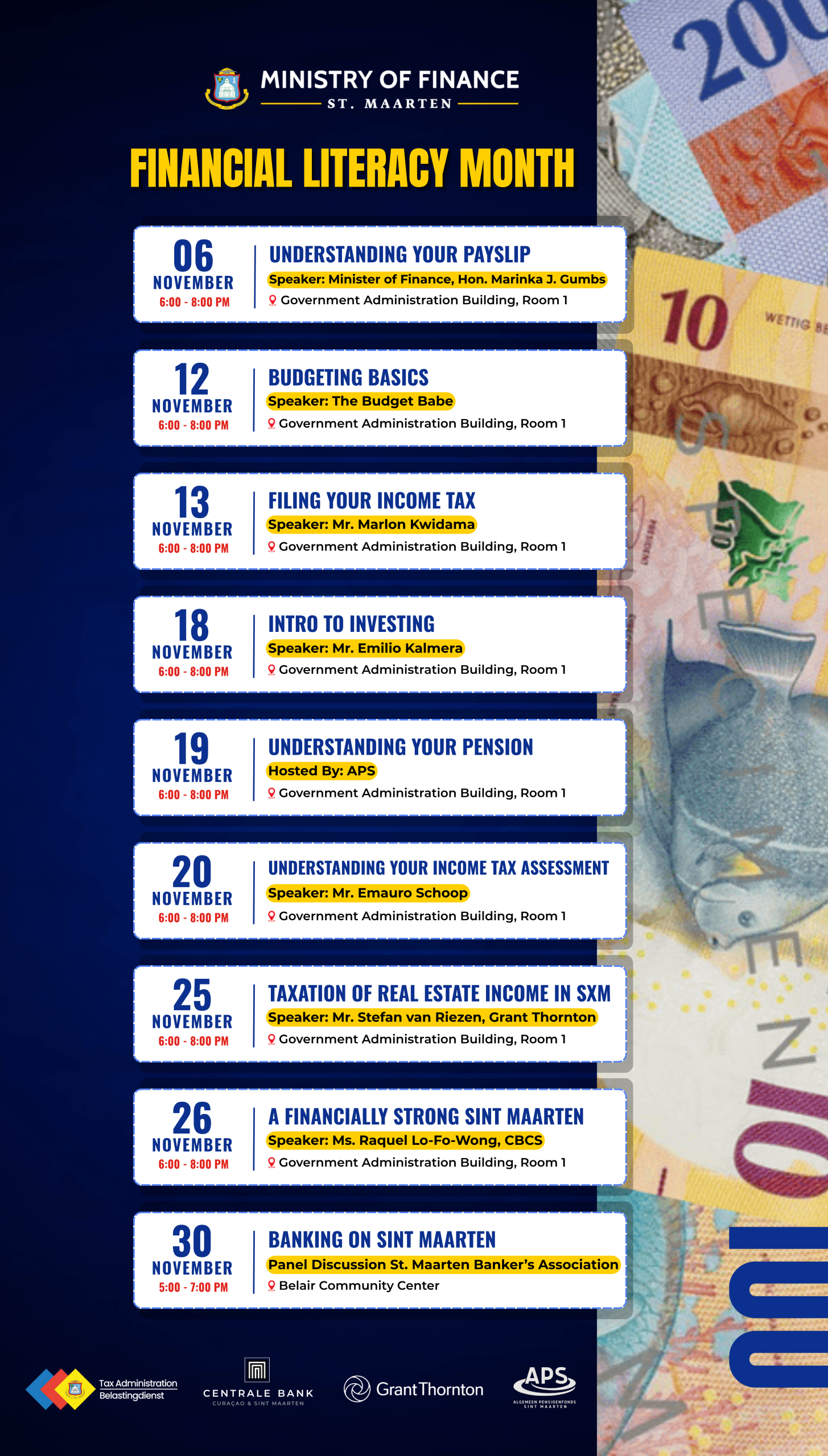 PHILIPSBURG, St. Maarten – En noviembre el Ministerio de Finanzas celebrará nuevamente el Mes de la Alfabetización Financiera (MAF), una iniciativa dedicada a empoderar a los ciudadanos con el conocimiento y las herramientas necesarias para tomar decisiones financieras informadas y construir un futuro más seguro.