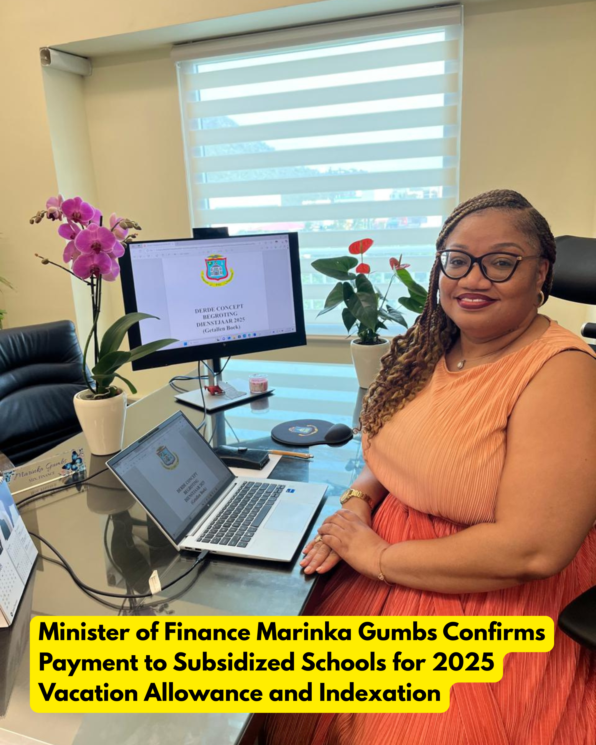 La Ministra de Finanzas, Marinka Gumbs, expresa su agradecimiento a todos los funcionarios y docentes por su continua dedicación y les recuerda que la indexación del 2% para el año 2025, con efecto retroactivo desde el 1ro de enero de 2025, se incluirá en la nómina de julio de 2025.