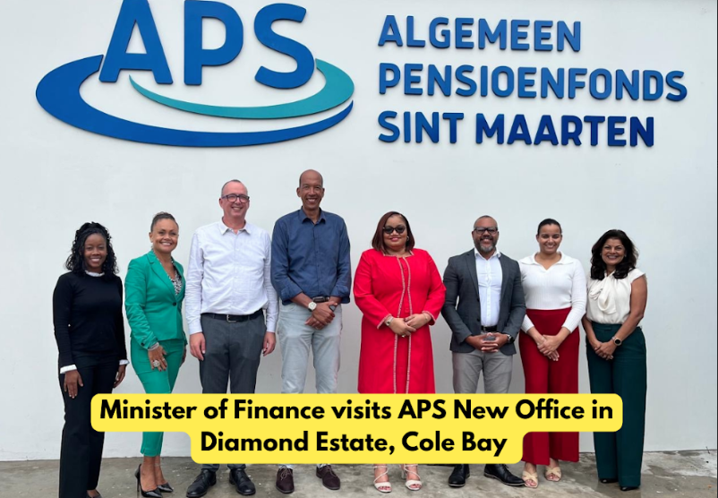 Philipsburg, St. Maarten — La Ministra de Finanzas, la Honorable Marinka J. Gumbs, realizó recientemente una visita de cortesía a la nueva oficina del Algemene Pensioenfonds Sint Maarten (APS), ubicada en Diamond Estate, Cole Bay, donde fue recibida por el Director de APS, Sr. Oscar Williams, y miembros del equipo de APS.