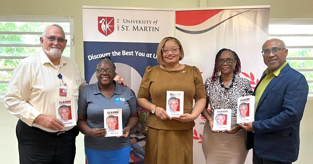 GREAT BAY, St. Maarten — La Ministra de Finanzas Marinka Gumbs le entregó a la Universidad de St. Martin (USM) 10 copias del libro, Claude: A Portrait of Power, como homenaje al legendario líder de Democratic Party en lo que habría sido su cumpleaños 98, el 24 de julio.