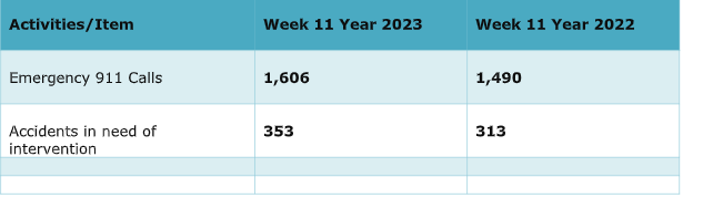Aquí hay una descripción general de los accidentes manejados por la policía y de las llamadas de emergencia al 911 hasta la semana 11.