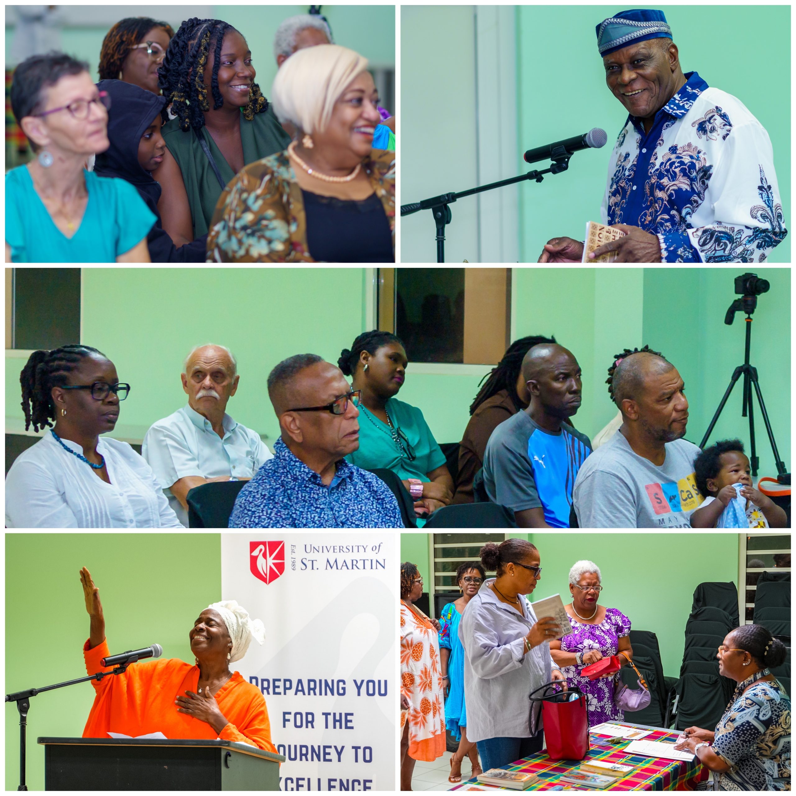 FOTO: Collage de miembros de la audiencia, orador invitado, artista de performance en el lanzamiento del libro Ixion & The Soufrière Suite del legendario poeta/músico vicentino Shake Keane (HNP, 2025), presentado por CLF y HNP. Universidad de San Martín (28/2/25). (Fotografía CB. © HNP.)