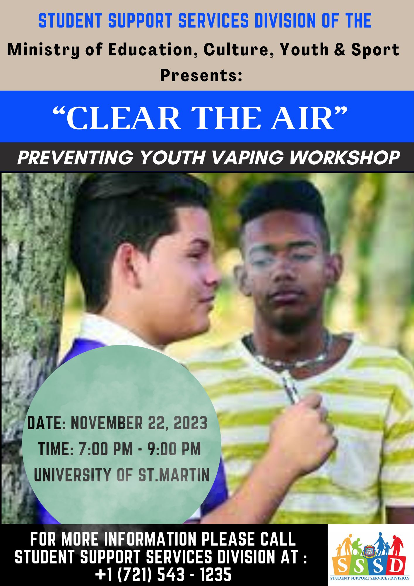 PHILIPSBURG, Sint Maarten – La División de Servicios de Apoyo Estudiantil (SSSD) del Ministerio de Educación, Cultura, Juventud y Deporte está organizando una sesión interactiva y reveladora titulada “Despejar el aire: Taller para prevenir el vapeo juvenil”.