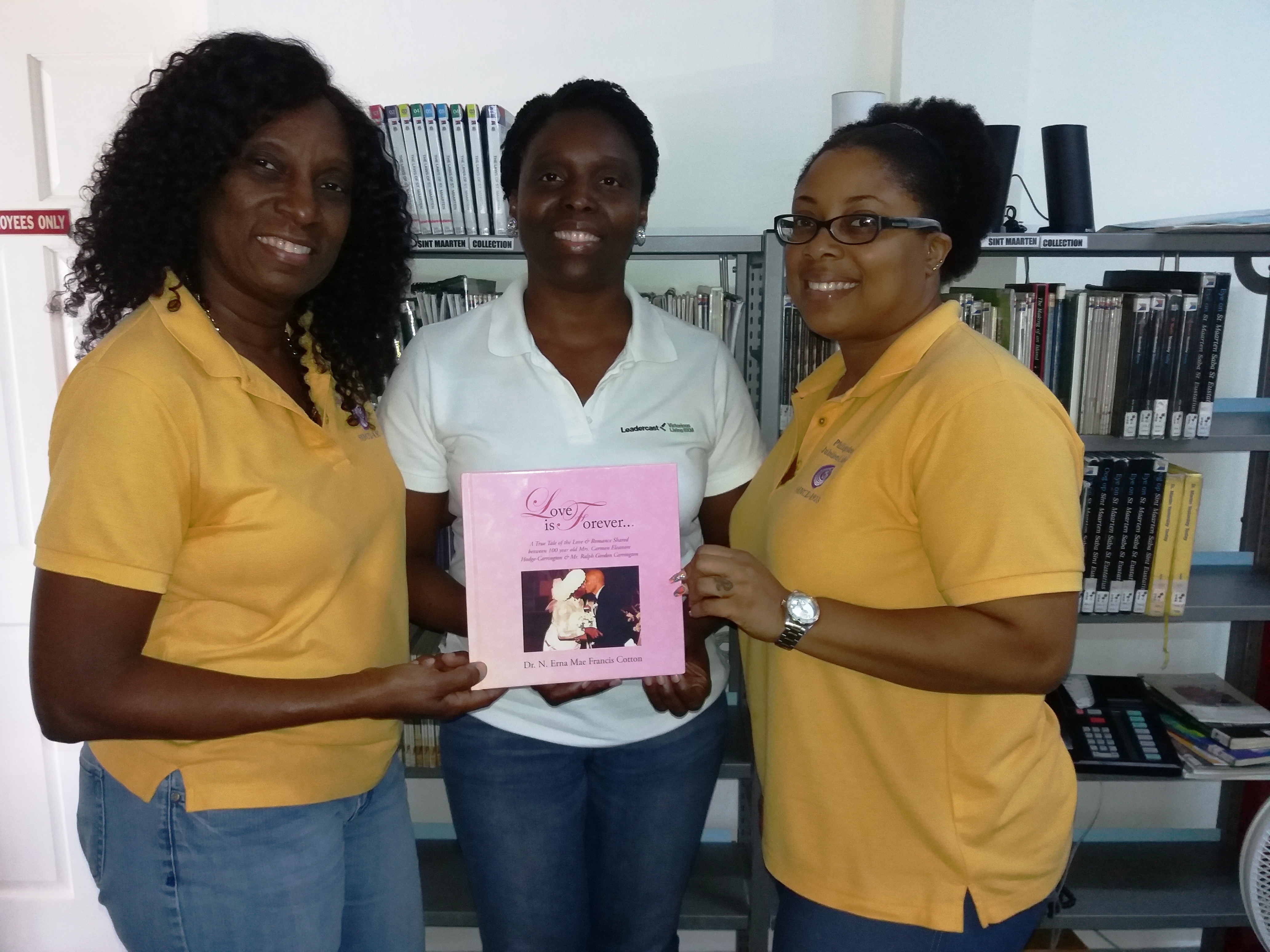 Currently, a limited number of copies of the hard and soft cover copies of Love is Forever… are available from the author and now are available at the Philipsburg Jubilee Library located upstairs of Adolphus Richardson Office Machines & Supplies N.V. on W.J.A. Nisbeth Road #3. Interim Director, Irmin Hughes and a staff member were on hand to enthusiastically welcome Love is Forever… to their local collection.