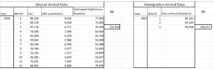 Debido al cambio de metodología, las comparaciones directas con datos de años anteriores no son metodológicamente sólidas. Sin embargo, para mantener cierto nivel de coherencia durante este período de transición, y según lo recomendado por el PJIAE, el Departamento de Estadística utilizó las cifras de llegadas a aeropuertos de enero a diciembre de 2024, ajustadas mediante la eliminación del 10 % para tener en cuenta a los viajeros residentes, como referencia para la comparación con los datos de inmigración de 2025, más precisos, que ya excluyen a los residentes. Esta deducción del 10 % es coherente con los datos históricos proporcionados por la Oficina de Inmigración que se remontan a la última década.