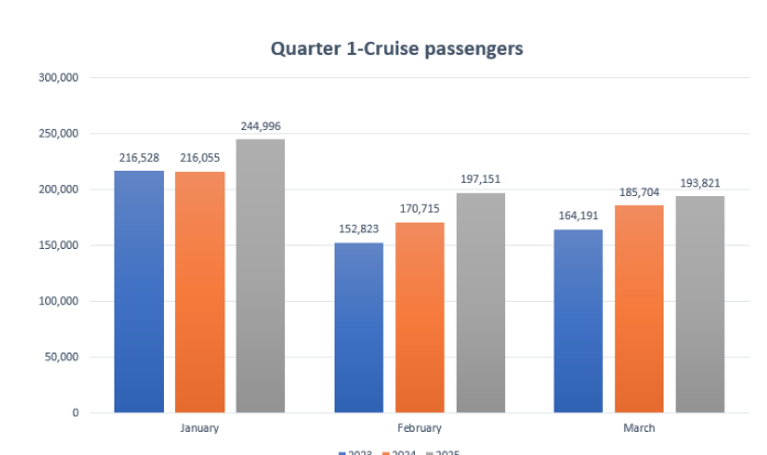 Según las nuevas cifras electrónicas de IBPS, St. Maarten registró un total de 256.923 pasajeros de crucero durante el primer trimestre (T1) de 2025. Esto representa un aumento del 10,8 % con respecto al primer trimestre de 2024, que registró 231.852 visitantes. (Llegadas al aeropuerto ajustadas del T1 de 2024). Este aumento representa 25.070 pasajeros de crucero adicionales en comparación con el mismo período del año anterior.
