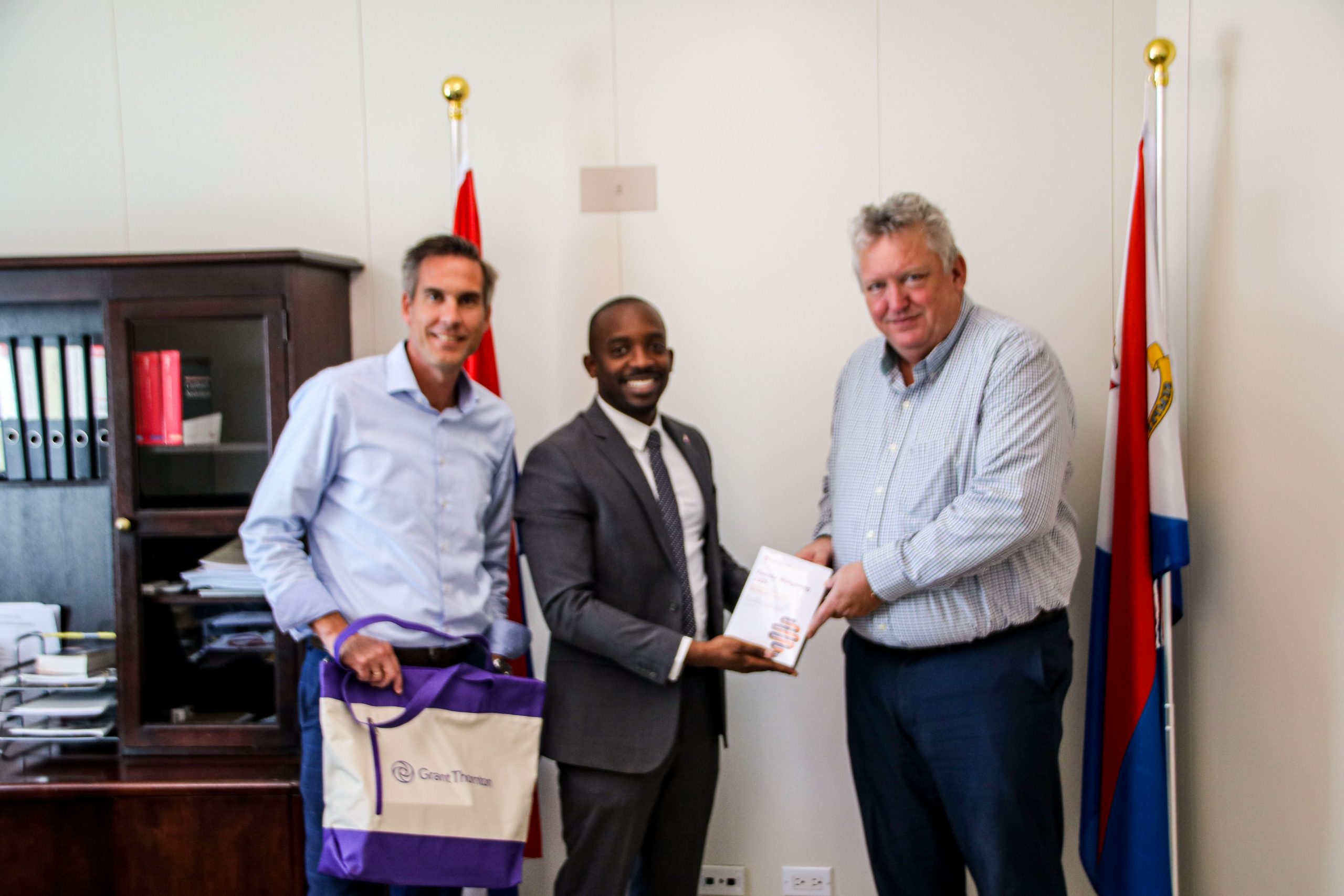 “Fiscale Wetgeving 2021” to the Minister of Finance of St. Maarten, Mr. Ardwell Irion. The publication was handed over by Paul van Vliet, Tax Partner and Herbert Beldman, Partner Assurance & Advisory Grant Thornton. The firm has been publishing an overview of current and relevant tax laws of Aruba, the BES islands, Curaçao and St. Maarten for more than 10 years now.