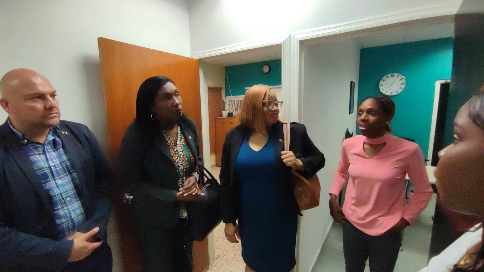 Después de las discusiones virtuales, la Ministra de VSA, Sra. Veronica Jansen-Webster, junto con la Ministra de Finanzas, Sra. Marinka Gumbs, participaron en un recorrido completo por la clínica de salud mental. Dirigido por el Director de Salud Mental y el personal, este recorrido brindó a las Ministras información importante sobre el estado actual de los servicios de salud mental y subrayó la importancia del Proyecto de Salud Mental.