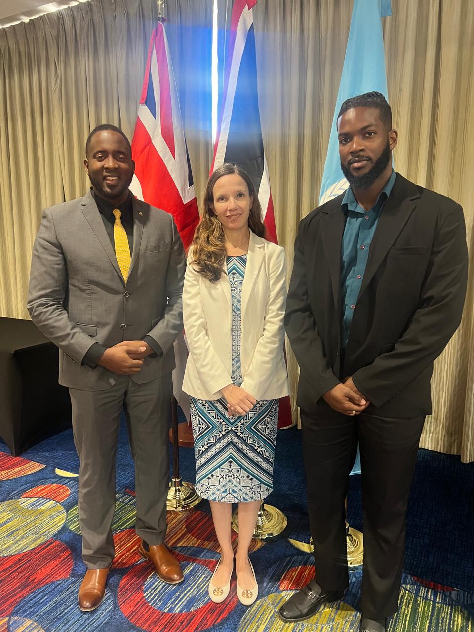 FOTO: De izquierda a derecha: el Ministro Lyndon Lewis, un representante de la ONUDD y el asesor principal de políticas del Ministro, Jerome Gumbs.