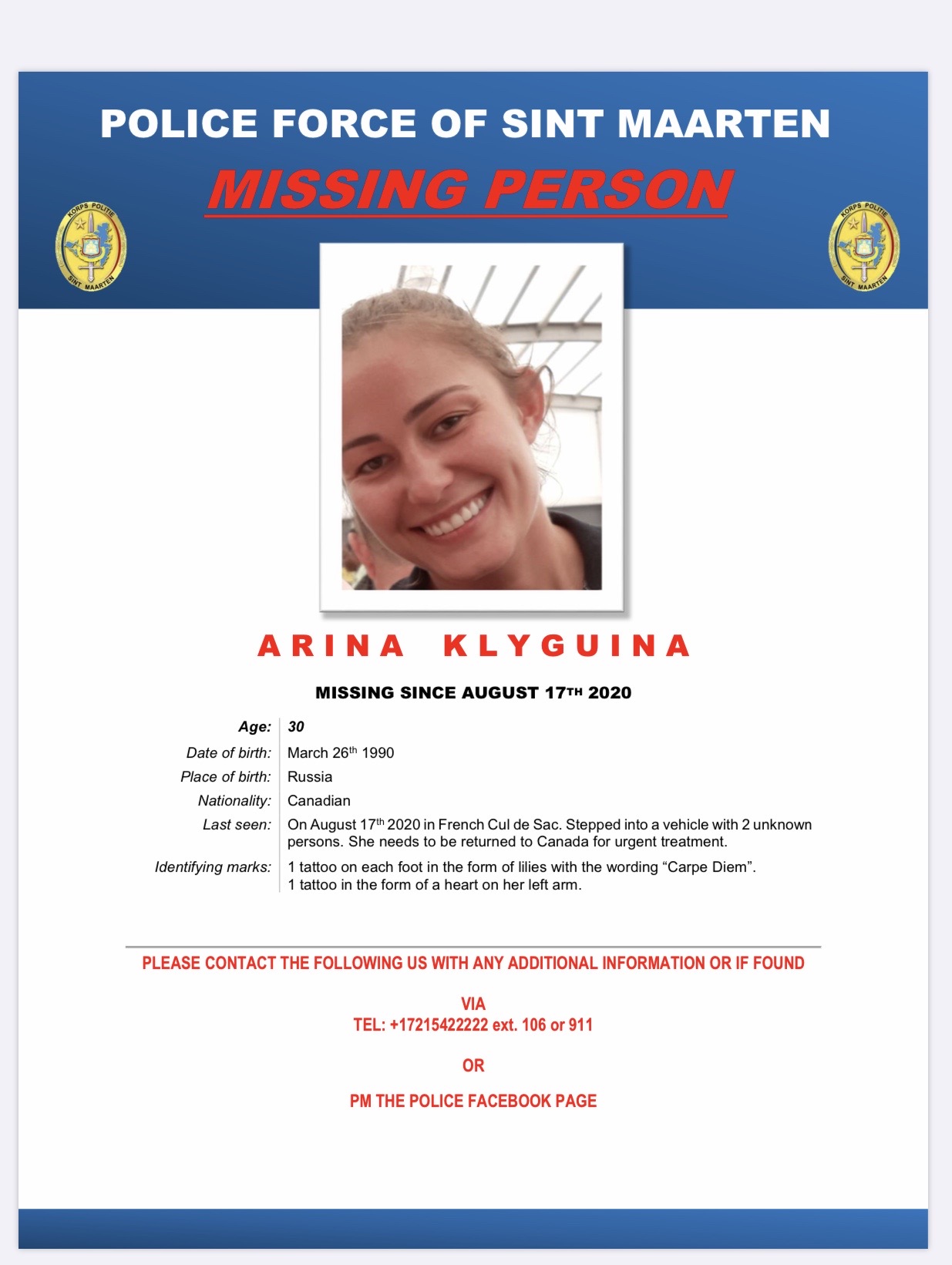 (Police Press Release). PHILIPSBURG, Sint Maarten – On Wednesday august 19th, 2020 a report of “Missing person” was filed at the Philipsburg Police Station by the husband of the lady, named Arina KLYGUINA, who was born in Russia on the 26th of March 1990.
