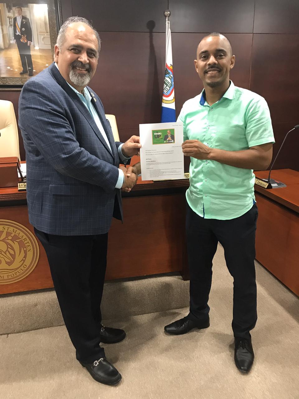 PHILIPSBURG, Sint Maarten – Member of Parliament Sidharth “Cookie” Bijlani on Monday presented Leader of the United People (UP) party MP Rolando Brison with his tourism focused contribution for the party’s platform for the 2020 Parliamentary Elections. Bijlani will be contesting the elections with the UP in the #7 position on the slate.