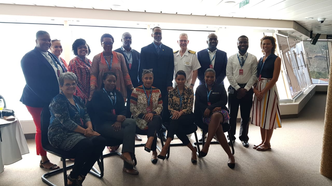PHOTO CUTLINE: Onboard the Norwegian Bliss, Minister of Tourism & Economic Affairs Hon. Rene Violenus (standing 6th from left) along with the Captain of the vessel and representatives from Port St. Maarten, the St. Maarten Tourist Bureau, a representative of the Anguilla Tourism Board, and representatives from the Cabinet of the Minister TEATT.
