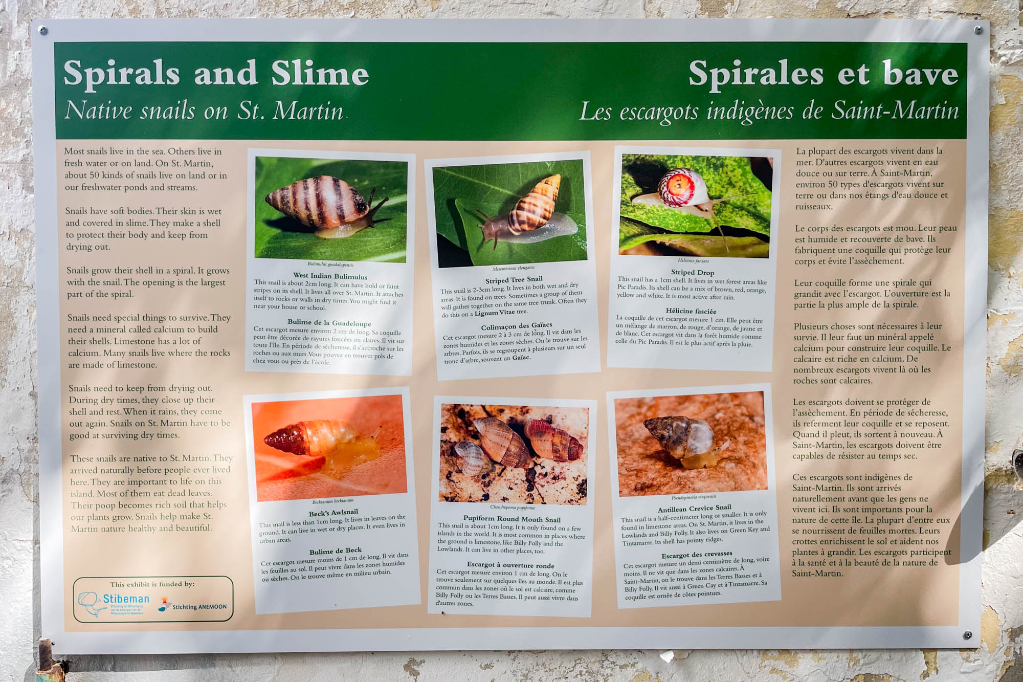 La asociación Les Fruits de Mer ha estado investigando los caracoles con la ayuda de Tello Neckheim, experto en caracoles y visitante frecuente de St. Maarten. Uno de los nuevos paneles incluye caracoles autóctonos y el otro, caracoles traídos a St. Maarten por la gente. La asociación planea desarrollar más paneles sobre caracoles, un libro para colorear y una guía de campo sobre caracoles locales. Existen alrededor de 50 especies de caracoles terrestres y de agua dulce en St. Maarten.