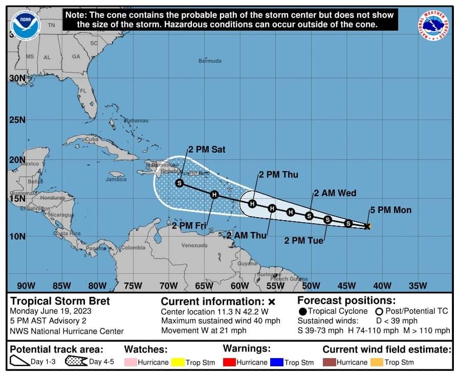 ODM proporcionará información adicional a medida que la tormenta se acerque a las Islas del Caribe Oriental. La tormenta tropical Bret está a más de 1000 millas de distancia en el Océano Atlántico.