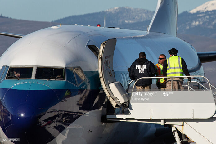YAKIMA, WA - FEBRUARY 18: Agents working for U.S. Immigration and Customs Enforcement (ICE) prepare to board detainees onto a Swift Air charter flight at McCormick Air Center on February 18, 2020 in Yakima, Washington. The U.S. Justice Department is suing King County after it banned ICE from operating charter flights for detainee transport at King County International Airport, forcing the agency to bus detainees to Yakima for flights there. (Photo by David Ryder/Getty Images)