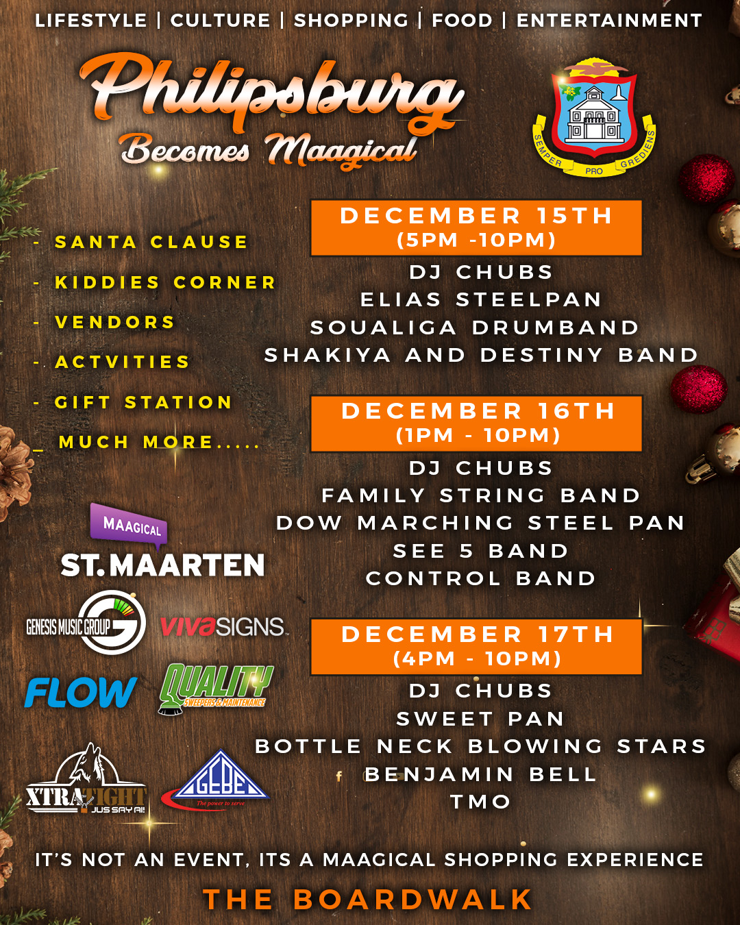 Madame Estate, Sint Maarten – En esta temporada navideña, Philipsburg se convertirá en un paraíso invernal, ya que Xtratight Entertainment presenta con orgullo “Philipsburg se convierte en Maagical”, un alegre evento que tendrá lugar del viernes 15 de diciembre al domingo 17 de diciembre en el Boardwalk. Se invita a la comunidad a sumergirse en el espíritu navideño y comenzar la temporada festiva con un fin de semana lleno de entretenimiento, compras y actividades para toda la familia.