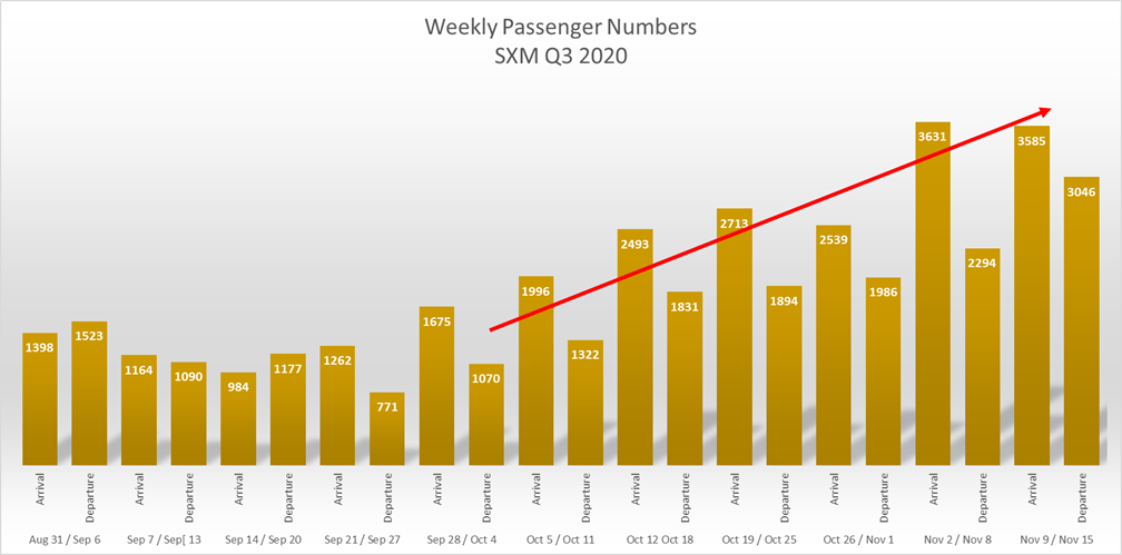 Since the reopening in August 2020, PJIAE’s Visitor Arrivalsgrew from 12% to 20% in October. Most of the airlines restarted their routes to Sint Maarten and indicated that the demand for Sint Maarten is high compared to other Caribbean destinations.