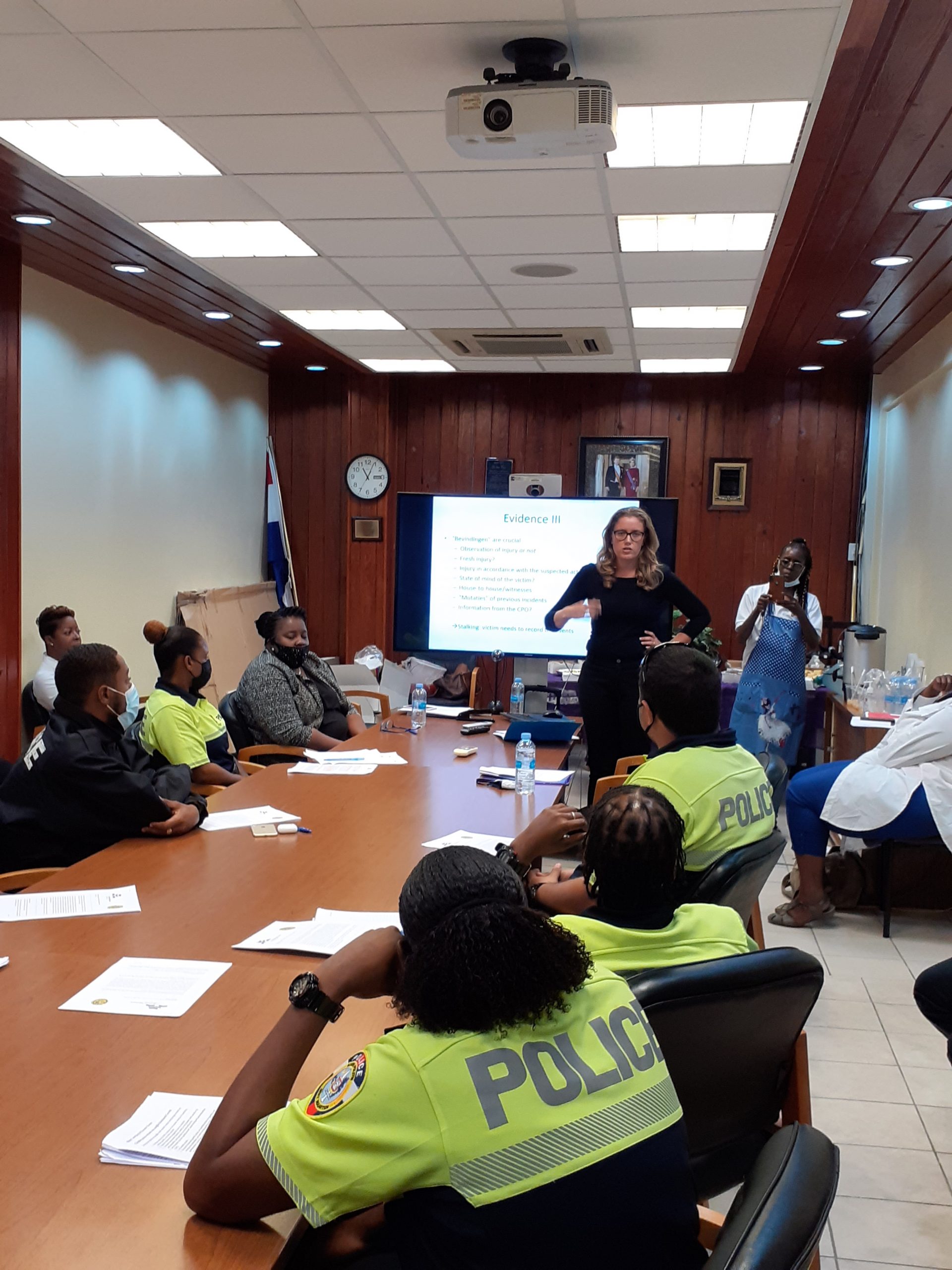 PHOTO CAPTION: Emily van Hees of OM SXM (standing second right) speaks to police officers at the relational violence workshop.