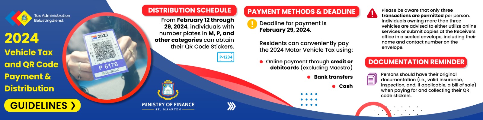 GREAT BAY, Sint Maarten — La Administración Tributaria de Sint Maarten recuerda urgentemente al público que el pago del impuesto sobre vehículos motorizados venció el 29 de febrero de 2024. Las personas con matrículas en las categorías M, P y todas las demás categorías pueden obtener su etiqueta de código QR en la Oficina del Síndico en Pond Island.