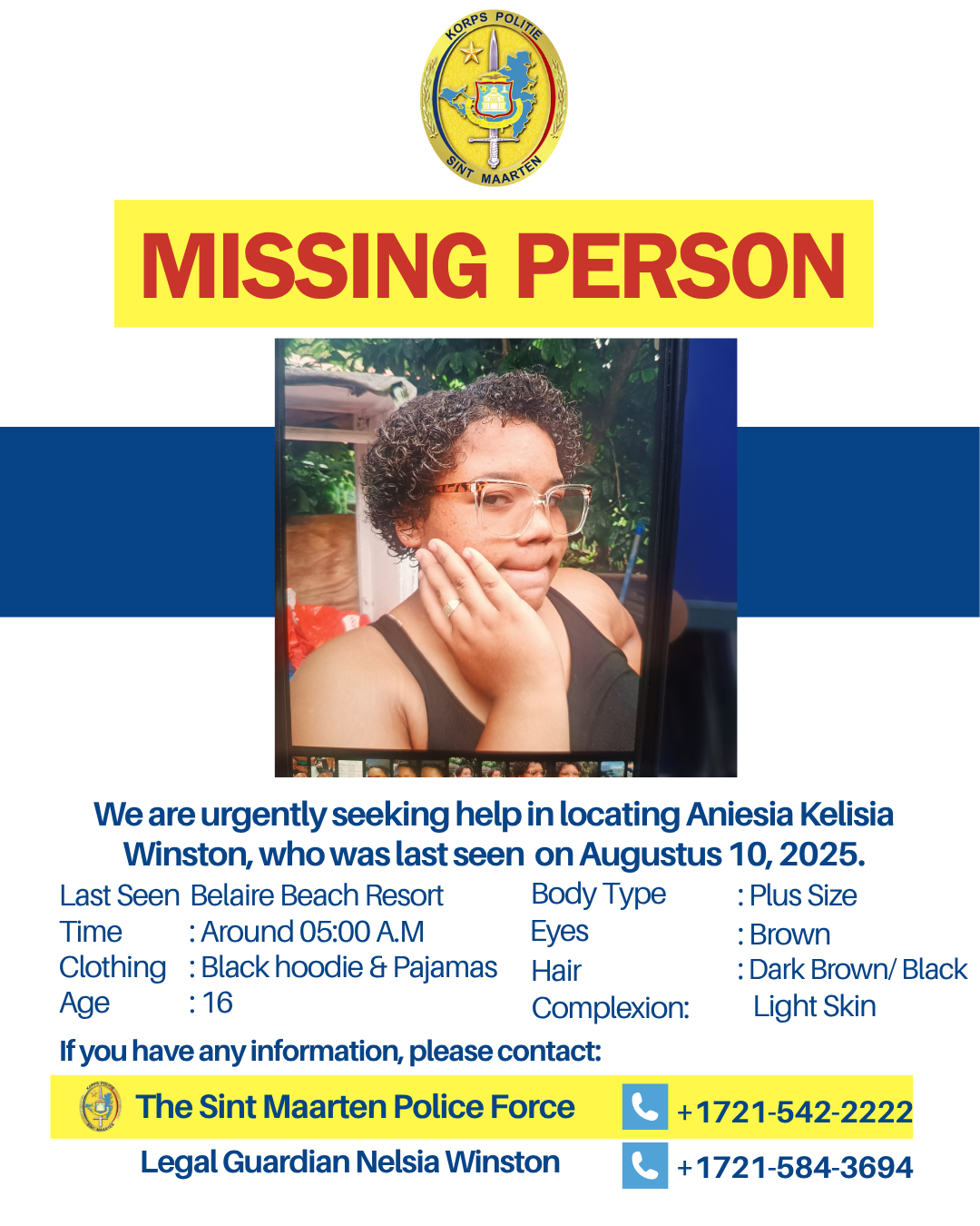 PHILIPSBURG, St. Maarten – La Policía de Sint Maarten (KPSM) solicita urgentemente la asistencia pública para localizar a Aniesia Kelisia Winston. Fue vista por última vez el 10 de agosto de 2025, aproximadamente a las 5:00am.