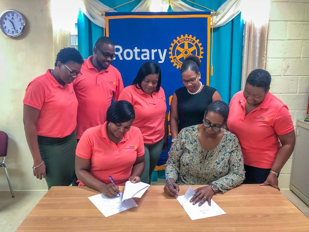 Pictured: President Jaida Nisbett and Adjunct Manager Sandra Mathew signing thememorandum of understanding as representatives of the club and school look on.