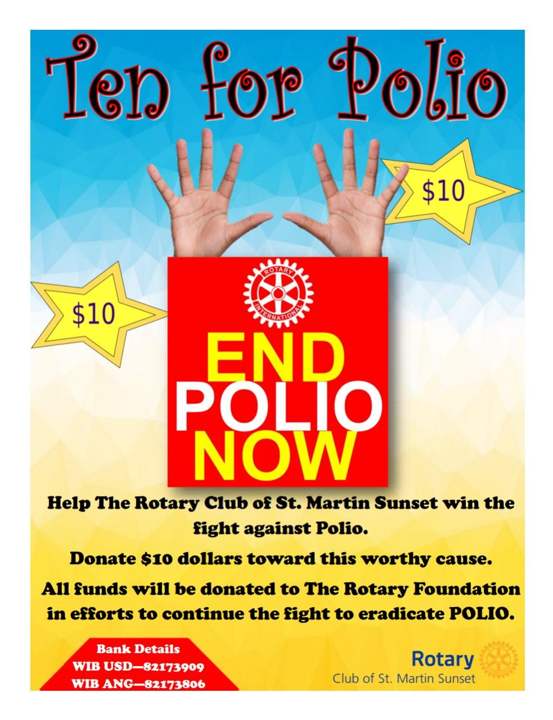On Saturday October 24th, 2020, the Rotary Club of St. Martin Sunset will be selling “End Polio Now” wristbands for 2 US dollars at Carrefour Market on the Bush Road and Fair Way Market in Point Blanche from 10:00am to 2:00pm. The club has also launched a, “Ten For Polio” fundraiser whereby the public is encouraged to donate 10 US dollars or more towards the eradication of Polio. Each dollar raised, the Bill and Melinda Gates Foundation will match it with an additional $2. The club’s account numbers are WIB- USD 82173909 or WIB- ANG 82173806 and all donors are encouraged to initialize their transfer with “Ten For Polio Donation” in the description slot. Persons can also contact the club for donation pickups.