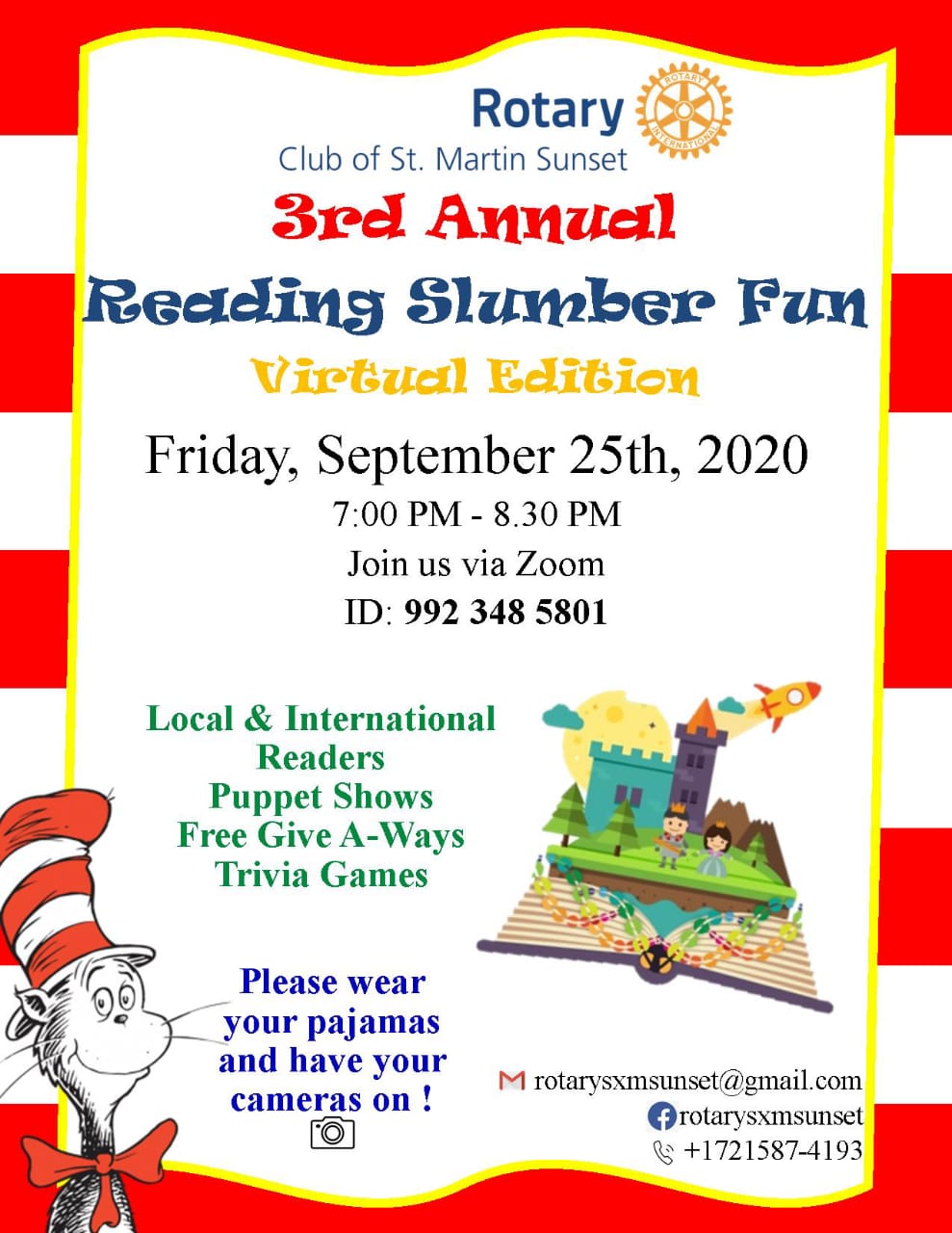 PHILIPSBURG, St. Maarten – On Friday September 25th, 2020, the Rotary Club of St. Martin Sunset will be hosting its third annual Reading Slumber Fun Event. The event will kick off at 7:00 pm sharp until 8:30 pm on the virtual platform, Zoom. This year’s “Reading Slumber
