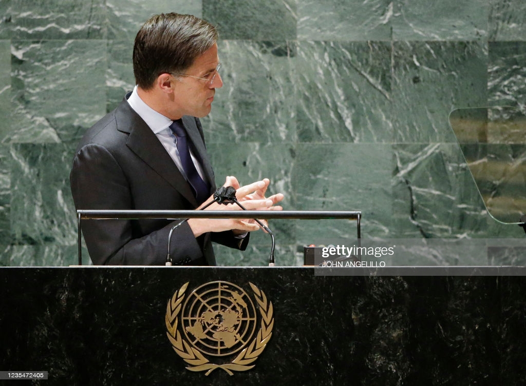 Netherlands Prime Minister Mark Rutte addresses the 76th session of the United Nations General Assembly at UN headquarters on September 24, 2021 in New York. (Photo by JOHN ANGELILLO / POOL / AFP) (Photo by JOHN ANGELILLO/POOL/AFP via Getty Images)
