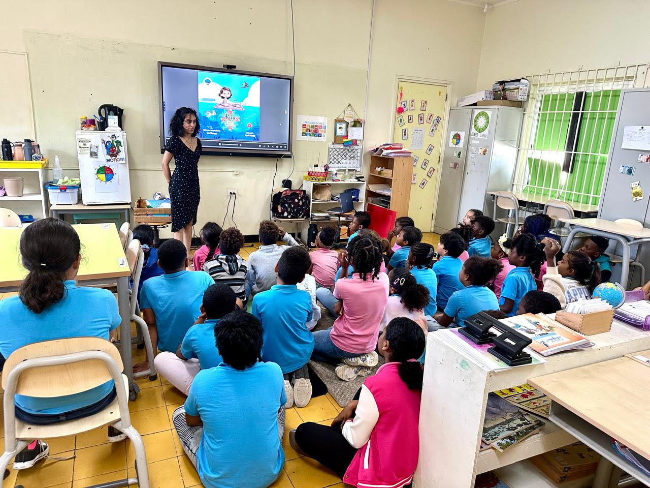 Oranjestad, Aruba – La galardonada activista ambiental, autora de libros infantiles y emprendedora social Sara Bharwani visitó Aruba del 4 al 6 de marzo en colaboración con la UNESCO Aruba para una gira especial de promoción de su libro “Kim salva el océano”. Mediante visitas a escuelas, donaciones de libros y una contribución a la biblioteca, la gira tuvo como objetivo educar e inspirar a la juventud arubeña sobre los peligros de la contaminación plástica, a la vez que presentaba a los niños arubeños el patrimonio de su isla hermana en el Caribe neerlandés.