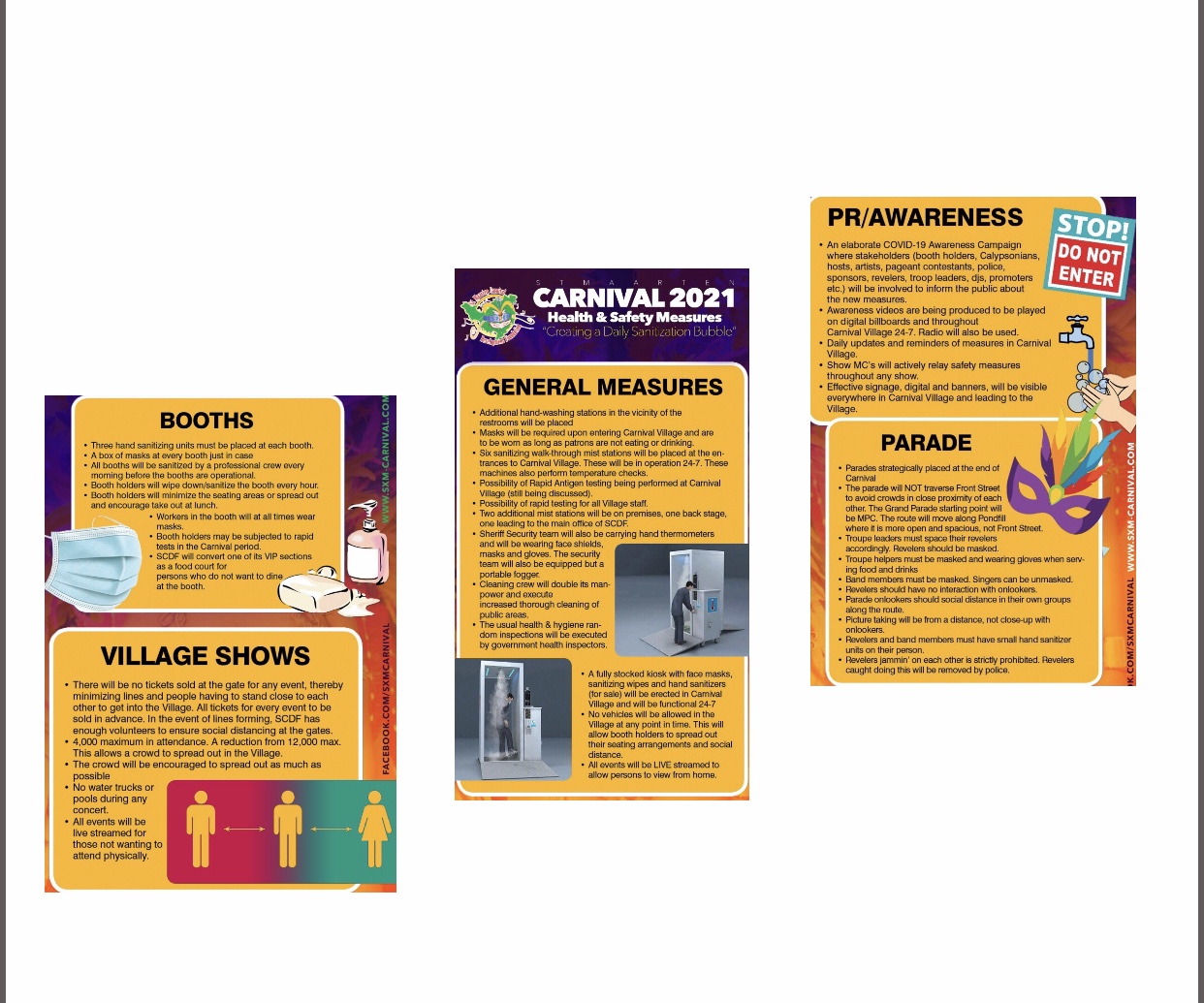 Relaciones públicas / Concientización: una elaborada campaña de concientización sobre COVID-19 en la que las partes interesadas (poseedores de stands, calipsonianos, anfitriones, artistas, concursantes de desfiles, policía, patrocinadores, juerguistas, líderes de tropas, djs, promotores, etc.) participarán para informar al público sobre la Medidas. – Se están produciendo videos de concientización para ser reproducidos en vallas publicitarias digitales y en todo el Carnival Village 24-7. También se utilizará la radio. – Actualizaciones diarias y recordatorios de medidas en el Carnival Village. – Los MC del programa transmitirán activamente las medidas de seguridad a lo largo de cualquier programa. – La señalización, digital y pancartas, será visible en todas partes en el Carnival Village y conduciendo a la Villa.