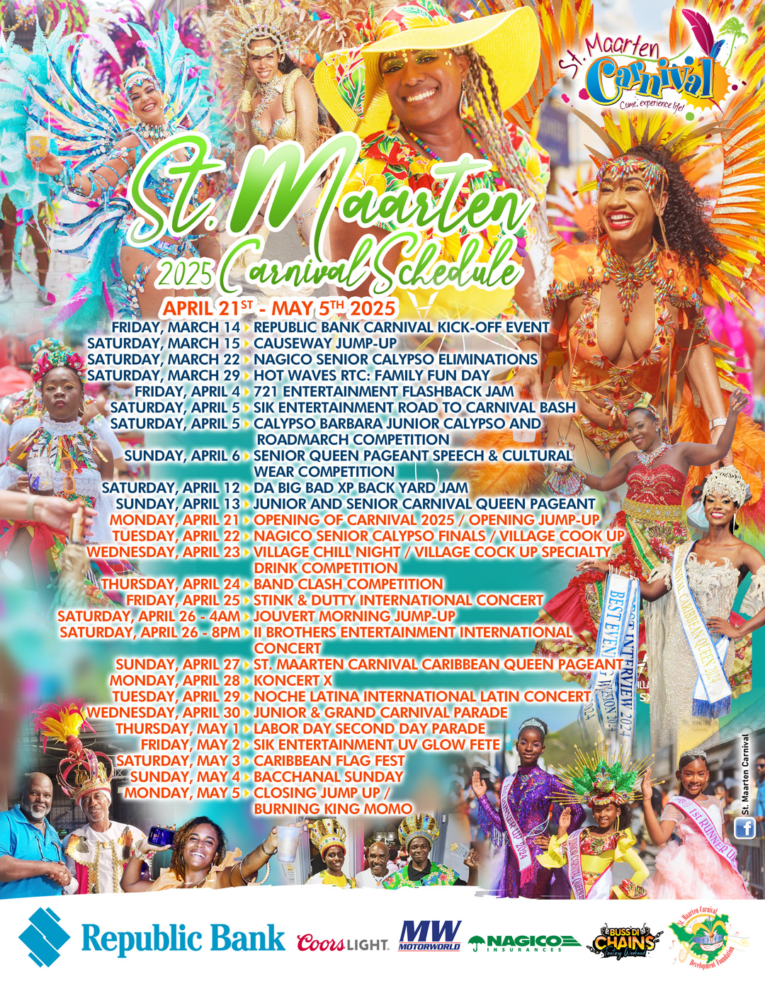 Los desfiles de carnaval juvenil y mayor se combinarán durante dos días, el 30 de abril y el 1ro de mayo, con los juveniles a la cabeza, seguidos de los adultos. Además, tras su éxito en 2024, SCDF traerá de vuelta el popular desfile de la Reina del Caribe del Carnaval de St. Maarten.