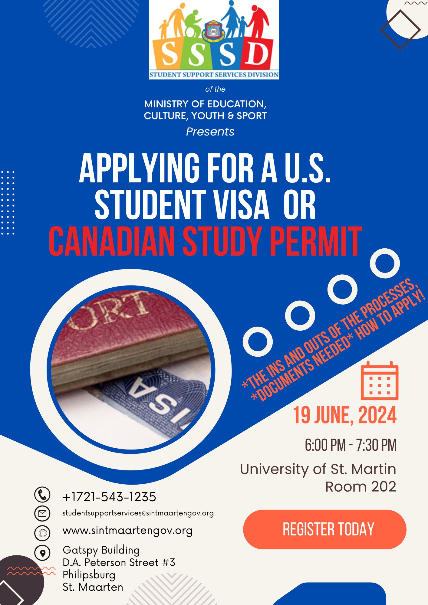 PHILIPSBURG Sint Maarten – Tener una visa de estudiante o permiso de estudio es uno de los primeros pasos legales que se necesitan antes de salir de la isla para estudiar en Estados Unidos o Canadá. En consecuencia, los Servicios de Apoyo al Estudiante. La División (SSSD) del Ministerio de Educación, Cultura, Juventud y Asuntos Deportivos organiza un taller titulado “Solicitud de una visa de estudiante estadounidense o un permiso canadiense” para el 19 de junio de 2024.