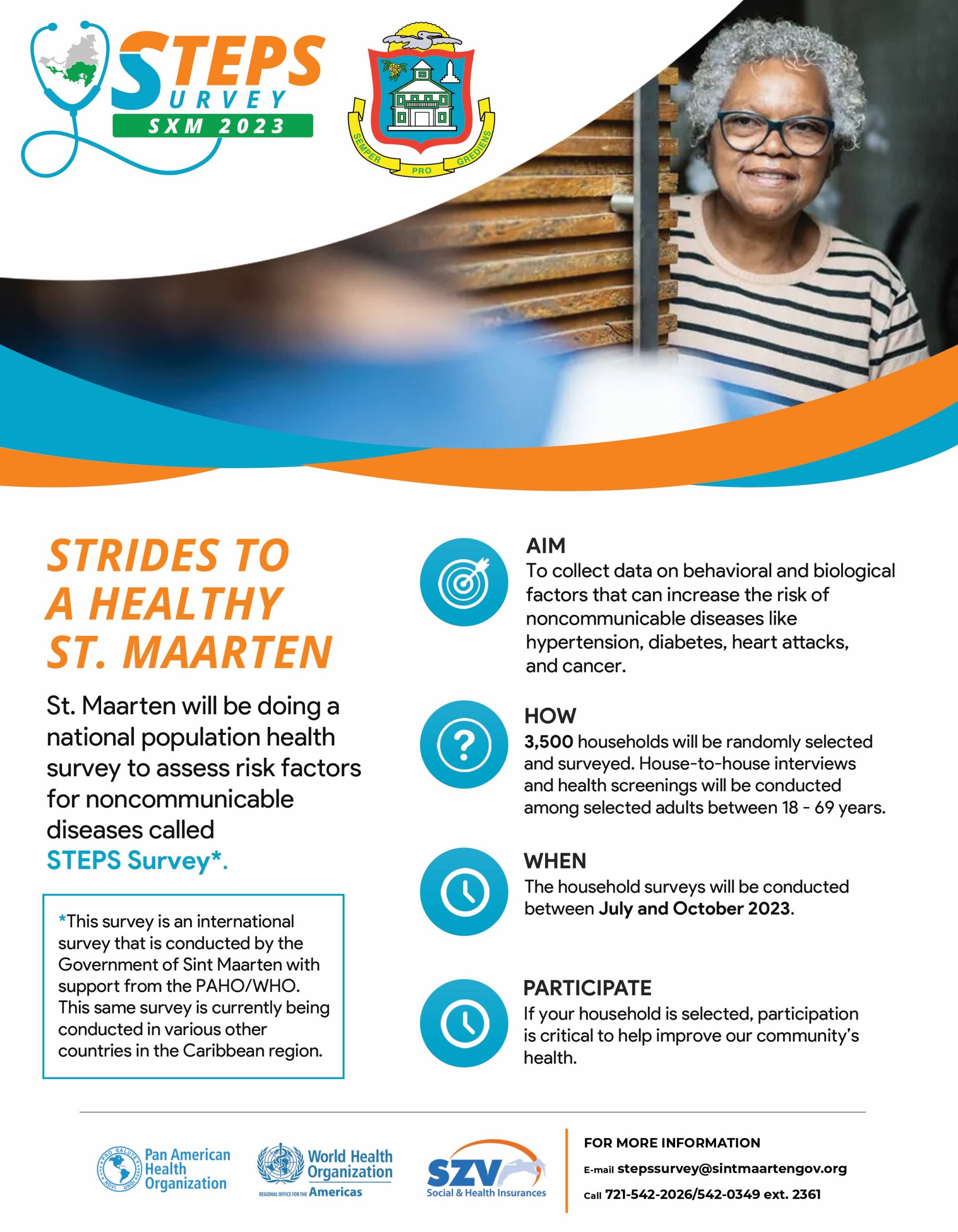 GREAT BAY, Sint Maarten (DCOMM) – El Departamento de Salud Pública del Ministerio de Salud Pública, Desarrollo Social y Trabajo (Ministerio VSA), las agencias ejecutivas de los Servicios de Prevención Colectiva (CPS), en conjunto con los Seguros Sociales y de Salud (SZV), y otras entidades relevantes. partes interesadas, iniciaron las Encuestas STEPS SXM 2023, una encuesta nacional de salud de la población para evaluar los factores de riesgo de enfermedades no transmisibles.