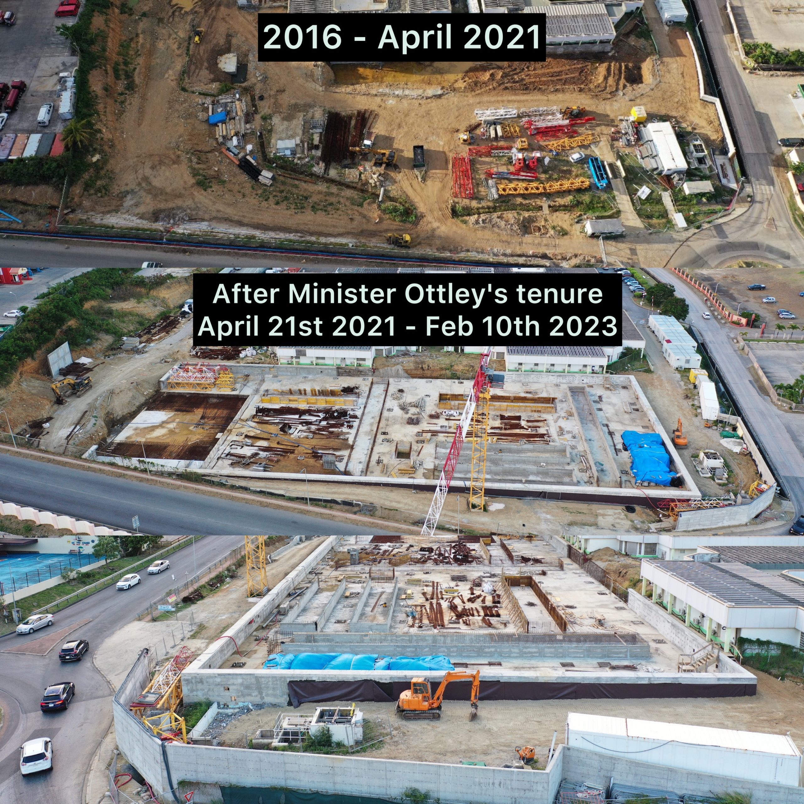 El ministro Ottley dijo: “Desde 2016, las administraciones anteriores solo hablaron de boquilla sobre el proceso de construcción. Cinco años después, en abril de 2021, no se vertió hormigón en la construcción del nuevo hospital”.