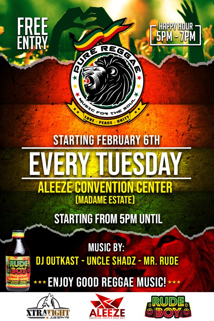 ¡Pero eso no es todo! Después de un día de descanso, estamos encantados de anunciar el lanzamiento de Pure Reggae Tuesdays el 6 de febrero, celebrando al legendario Bob Marley. Únase a nosotros a partir de las 5:00pm para una velada llena de los mejores ritmos de reggae. Aprovecha nuestras especiales Happy Hour de 5:00pm a 7:00pm ¡y la entrada es totalmente gratuita!