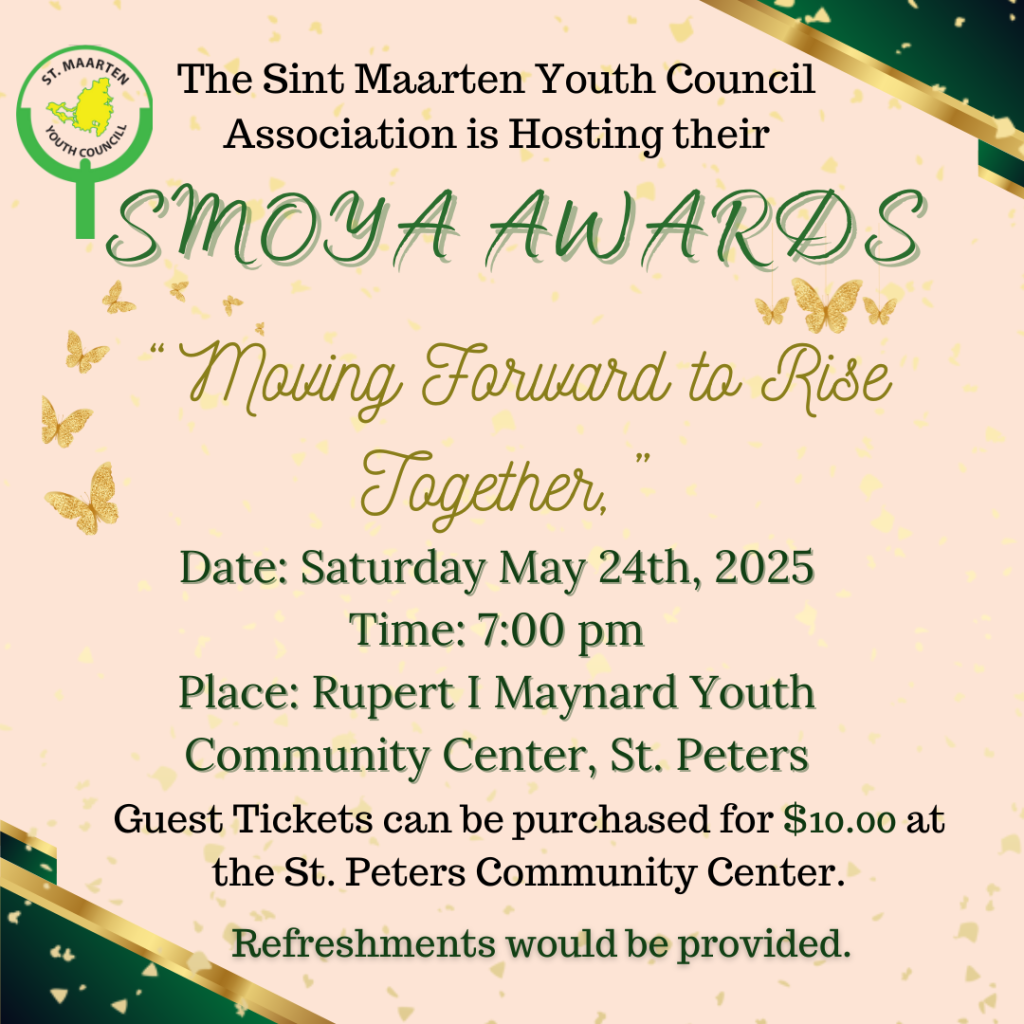 ST. PETERS, St. Maarten – La Asociación del Consejo Juvenil de St. Maarten se complace en anunciar que la Ceremonia de los Premios SMOYA a la Juventud Destacada de Sint Maarten se celebrará el sábado 24 de mayo a las 7:00pm en el Centro Comunitario Juvenil Rupert I. Maynard de St. Peters.