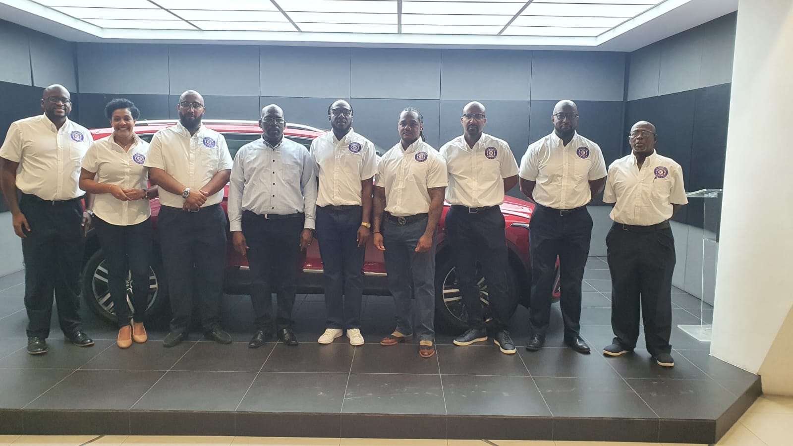 From Left to Right Jamaal Cummins League Official Coordinator, Solange Ludmilla Duncan Sponsorship, Johnnie Richardson General Secretary, Honorable Minister Sports Rodolph Samuel, Austin Helliger President, Dimar Labega Treasurer and Strengthen & Condition Coordinator, Jason Richardson Player Development, Renate Brison District & School Coordinator and Marcus Levenstone League Coordinator.