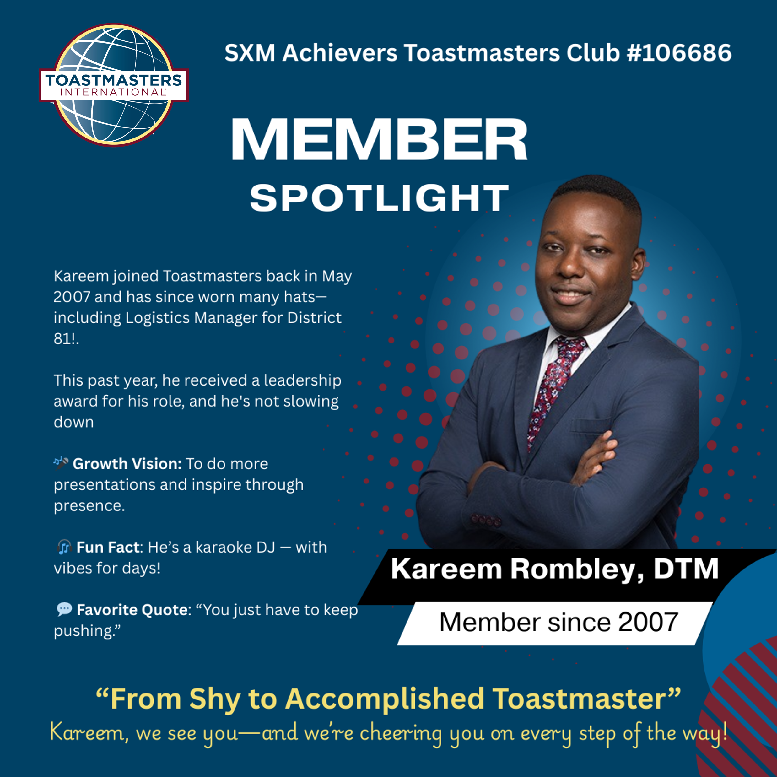 ST. MAARTEN – Como antesala de uno de nuestros próximos grandes eventos, nuestro Club destacará a socios destacados mediante presentaciones mensuales. Esta iniciativa sirve tanto para celebrar los logros de nuestros socios como para inspirar a otros en nuestra comunidad, mostrando el impacto del liderazgo y el crecimiento de Toastmasters.