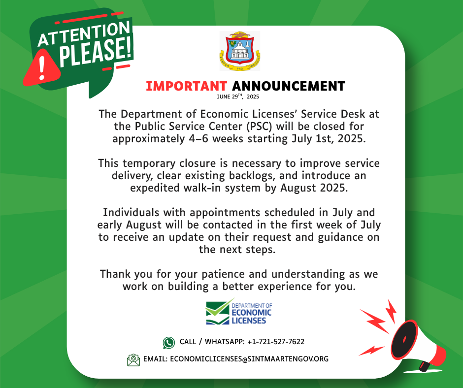 PHILIPSBURG, St. Maarten — El Ministerio de Turismo, Asuntos Económicos, Transporte y Telecomunicaciones (TEATT), bajo la dirección de la Ministra Grisha Heyliger-Marten, anunció el cierre temporal de la oficina de atención al público del Departamento de Licencias Económicas en el Centro de Atención al Público (CAP), a partir del 1ro de julio de 2025, por un período de cuatro a seis semanas.