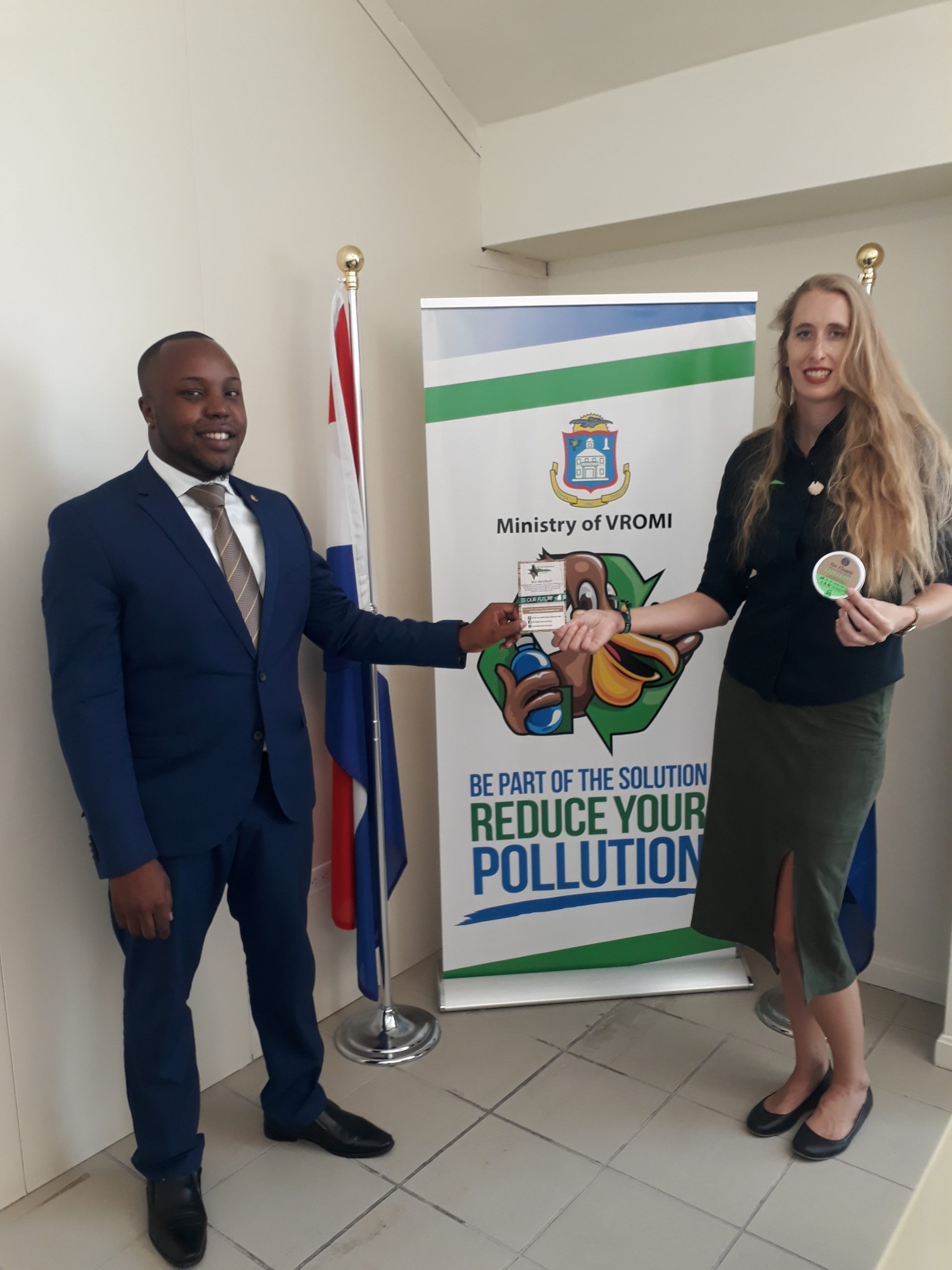 Nature Foundation’s Manager Melanie Meijer zu Schlochtern presented the Foundation’s Eco-Bracelet along with a plastic free and reef safe sunscreen ‘Raw Elements’ to the VROMI Minster on Monday in order to celebrate the importance of our ocean and marine life and to enhance and sustain the protection of our coral reefs. “In order to ensure coral reefs and marine life in the future, it is crucial to protect and conserve their habitats right now. Our coral reefs are highly threatened due to pollution, wastewater and nutrient input, diseases, hurricanes and rising ocean temperatures and on top also by chemical sunscreens. It is time that we panic about the health of our reefs, as coral reefs are of great importance to our tourist industry, the health of our fish stocks, sandy beaches, clarity of our waters and the protection from storms”.