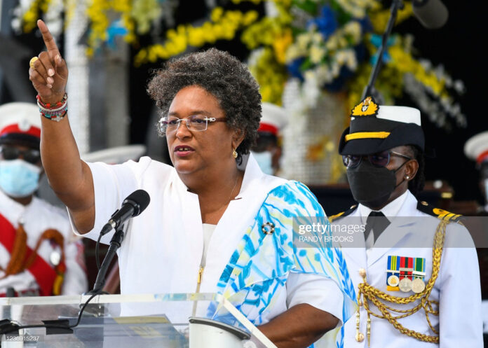 The Prime Minister of Barbados, Mia Amor Mottley, speaks during the National Honors ceremony and Independence Day Parade at Heroes Square in Bridgetown, Barbados, on November 30, 2021. (Photo by Randy Brooks / AFP) (Photo by RANDY BROOKS/AFP via Getty Images)