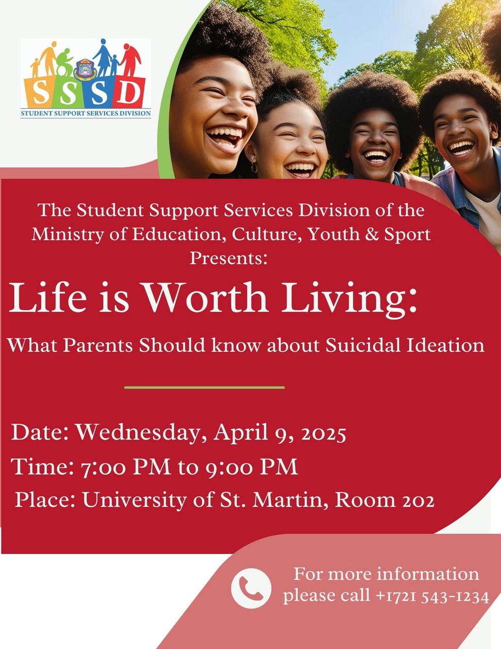 PHILIPSBURG, St. Maarten – El Ministerio de Educación, Cultura, Juventud y Deporte se complace en anunciar una importante y oportuna sesión informativa para padres titulada “Vale la pena vivir: Lo que los padres deben saber sobre la ideación suicida”. Este evento interactivo está diseñado para brindar a los padres el conocimiento y las herramientas necesarias para apoyar a sus hijos e hijos adolescentes que puedan estar experimentando pensamientos suicidas.