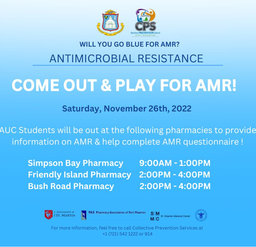 GREAT BAY, Sint Maarten (DCOMM) – El sábado 26 de noviembre de 2002, los estudiantes de la Escuela de Medicina de la Universidad Americana del Caribe (AUC) estarán en varias farmacias para brindar información sobre la resistencia a los antimicrobianos (AMR) y ayudar a completar un cuestionario bajo el lema ‘Come Out & Play for AMR’.