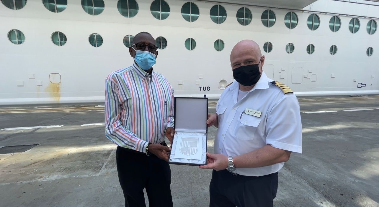 PORT ST. MAARTEN – Viking Ocean Cruises cruise ship Viking Orion arrived in port on Saturday morning, marking the return of another cruise line to the destination. A small pier side reception took place to officially welcome Viking Orion followed by the traditional inaugural call plaque exchange.