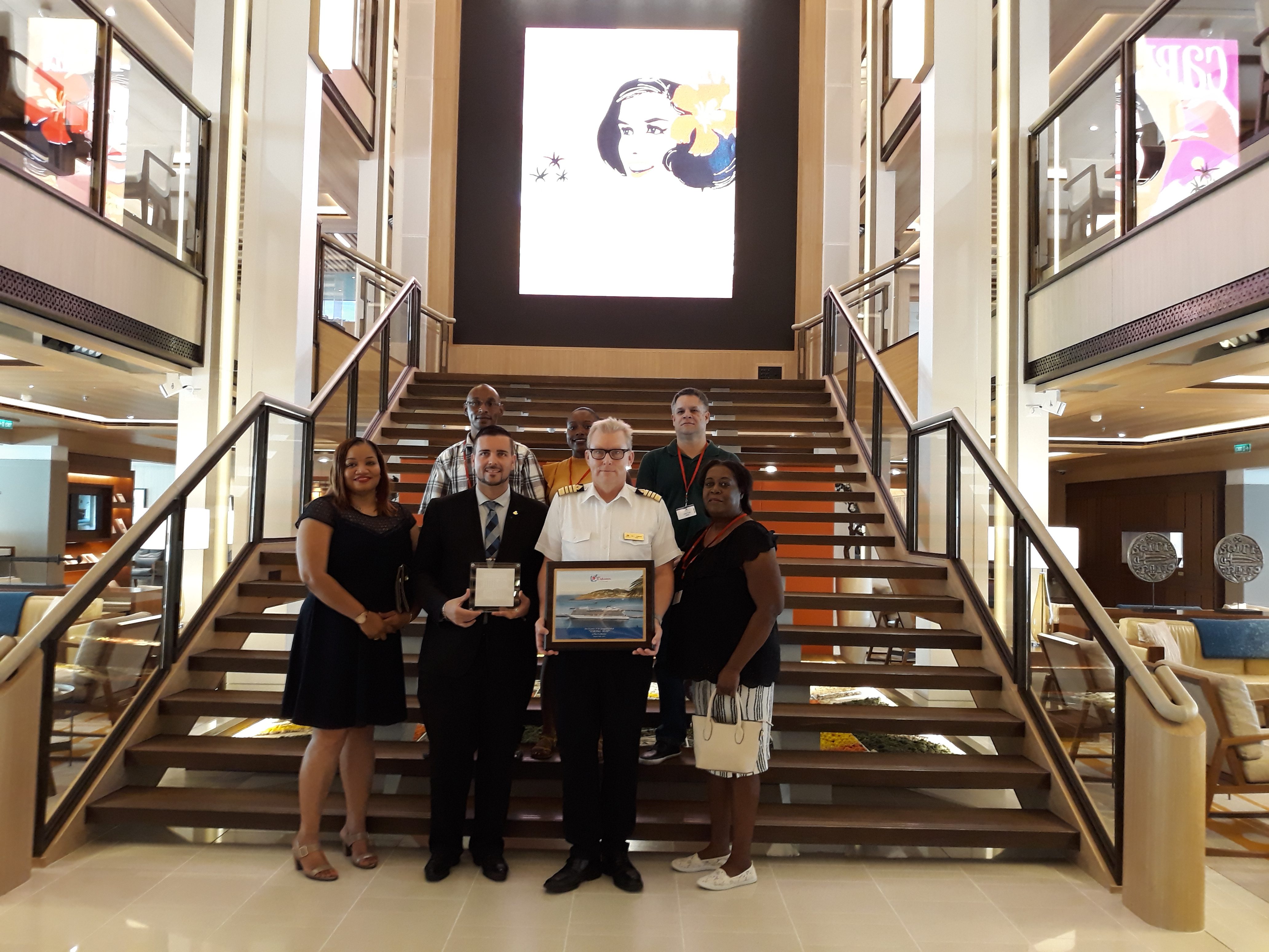 Captain Lars Kjeldsen was welcomed by Minister of Tourism & Economic Affairs Stuart Johnson and a delegation from Port St. Maarten along with some invited guests during the official welcome plaque exchange ceremony onboard the vessel.