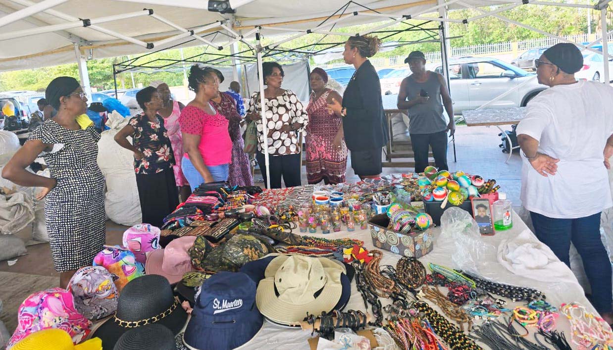 GREAT BAY, St. Maarten — La semana pasada, la Ministra de Turismo, Asuntos Económicos, Transporte y Telecomunicaciones, Grisha Heyliger-Marten (3.ª R), realizó una visita no anunciada a las pequeñas empresarias alojadas temporalmente en el Pabellón en el antiguo edificio de la Administración del Gobierno mientras se inician las obras del Mercado de Philipsburg en Backstreet.